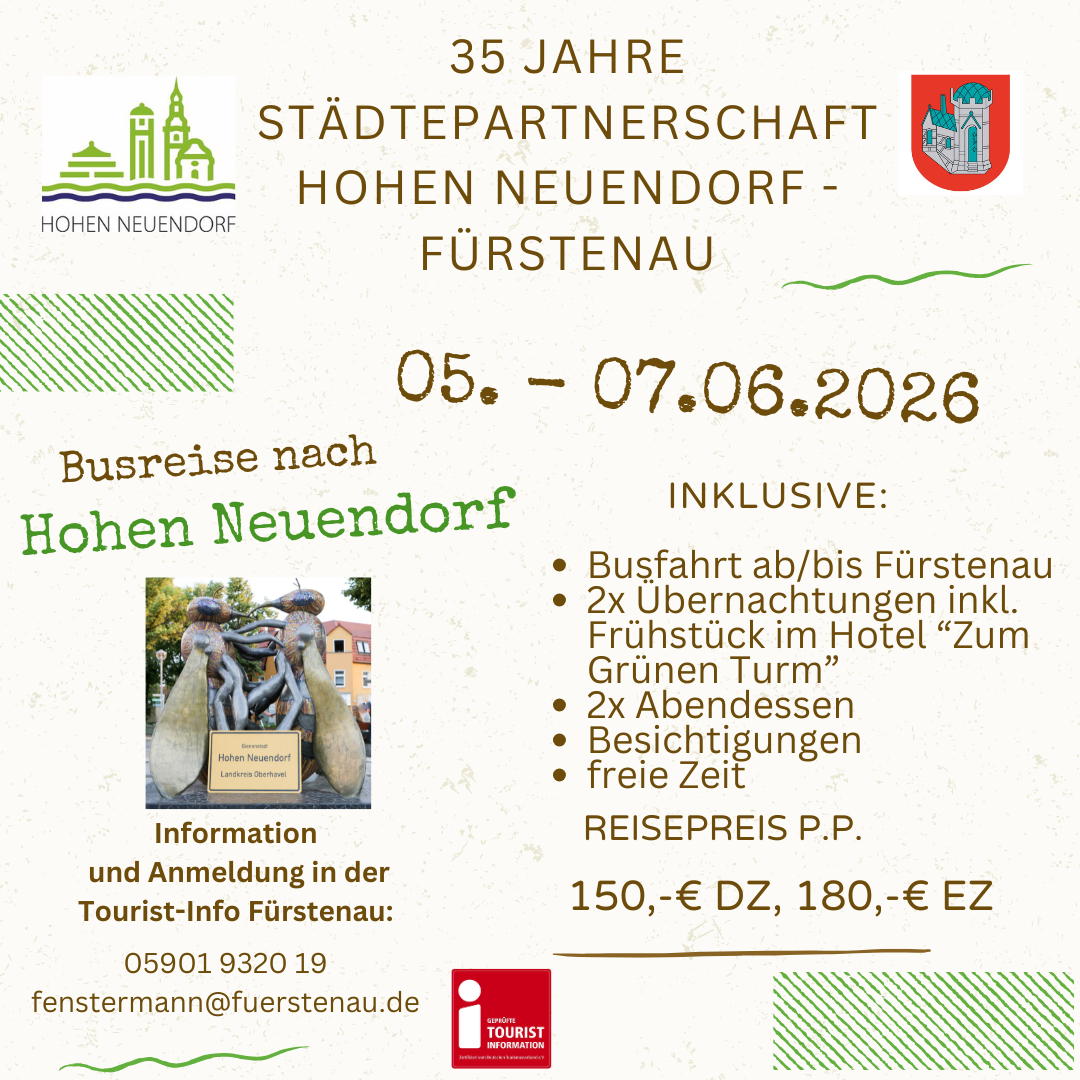 10.02.2026 35 Jahre Städtepartnerschaft Fürstenau – Hohen Neuendorf10.02.2026Seit 35 Jahren verbindet Fürstenau und Hohen Neuendorf eine lebendige Städtepartnerschaft voller Begegnungen, Freundschaften und gemeinsamer Erlebnisse. Dieses besondere Jubiläum möchten wir im Juni gemeinsam feiern.Mehr